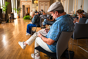 Zazpi topaketa-ikerketaren lehen saioa Hiriko Etxeko Saloi Handian izan zen irailaren 20an, Ondarearen Europako Egunen harira. Hogeita hamar bat amateur bildu ziren nahi bezala marrazteko leiho batetik ikusten zen ikuspegia, sabaia kaxetadun zoragarria duen gelaren perspektiba, kristalezko kandelabroa... Urban Sketchers-en lau administratzaile taldearekin bat egin zuten, galdera posibleei erantzuteko eta aholku batzuk emateko. Hori da baita ere saio bakoitzaren printzipioa.