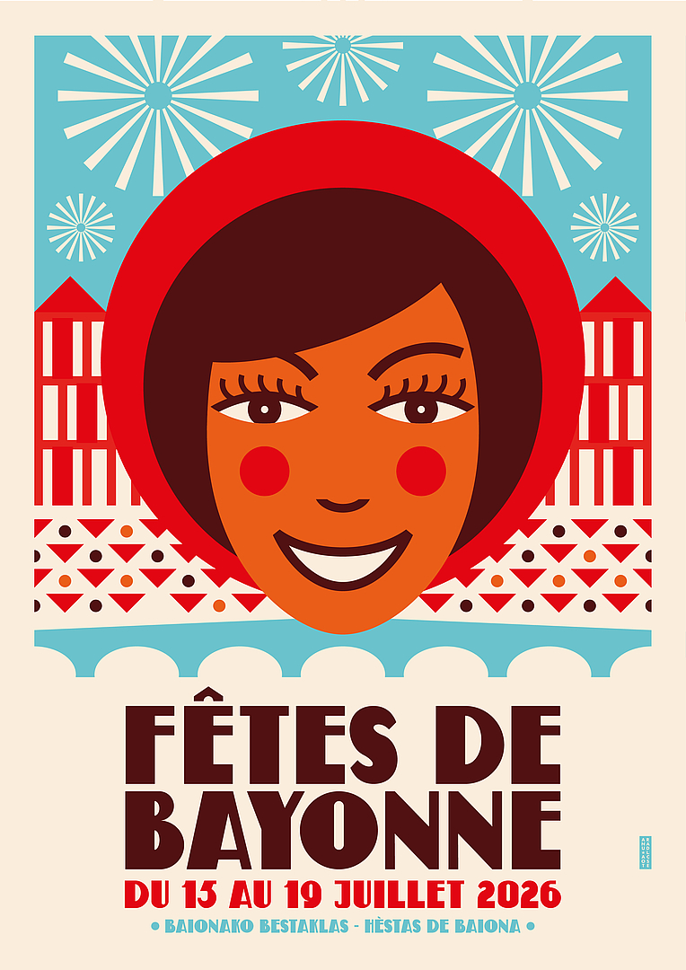 Cette affiche propose de représenter les Fêtes de Bayonne à travers une figure humaine centrale afin de rappeler que cette célébration est avant tout portée par celles et ceux qui la font vivre. Le choix d’un visage féminin s’est imposé naturellement comme une figure fédératrice, capable d’incarner l’esprit d’accueil, de convivialité et de partage propre aux fêtes. Cette présence féminine, souriante et sereine, crée un lien immédiat avec le spectateur et invite à la participation. La figure représentée n’est pas un portrait mais une incarnation symbolique : elle exprime la fierté, la chaleur humaine et l’élan collectif qui traversent les fêtes, et suggère un sourire partagé, appelé à se diffuser dans toute la ville.