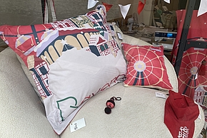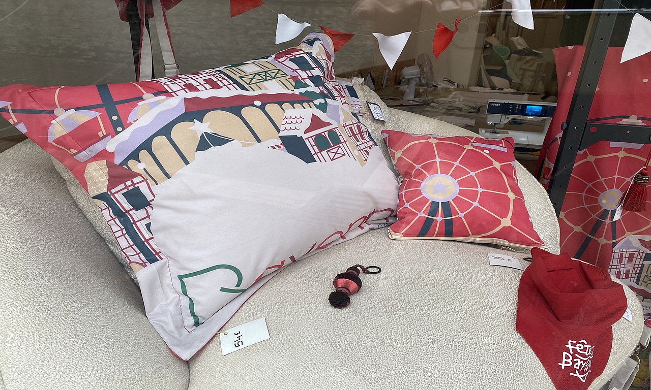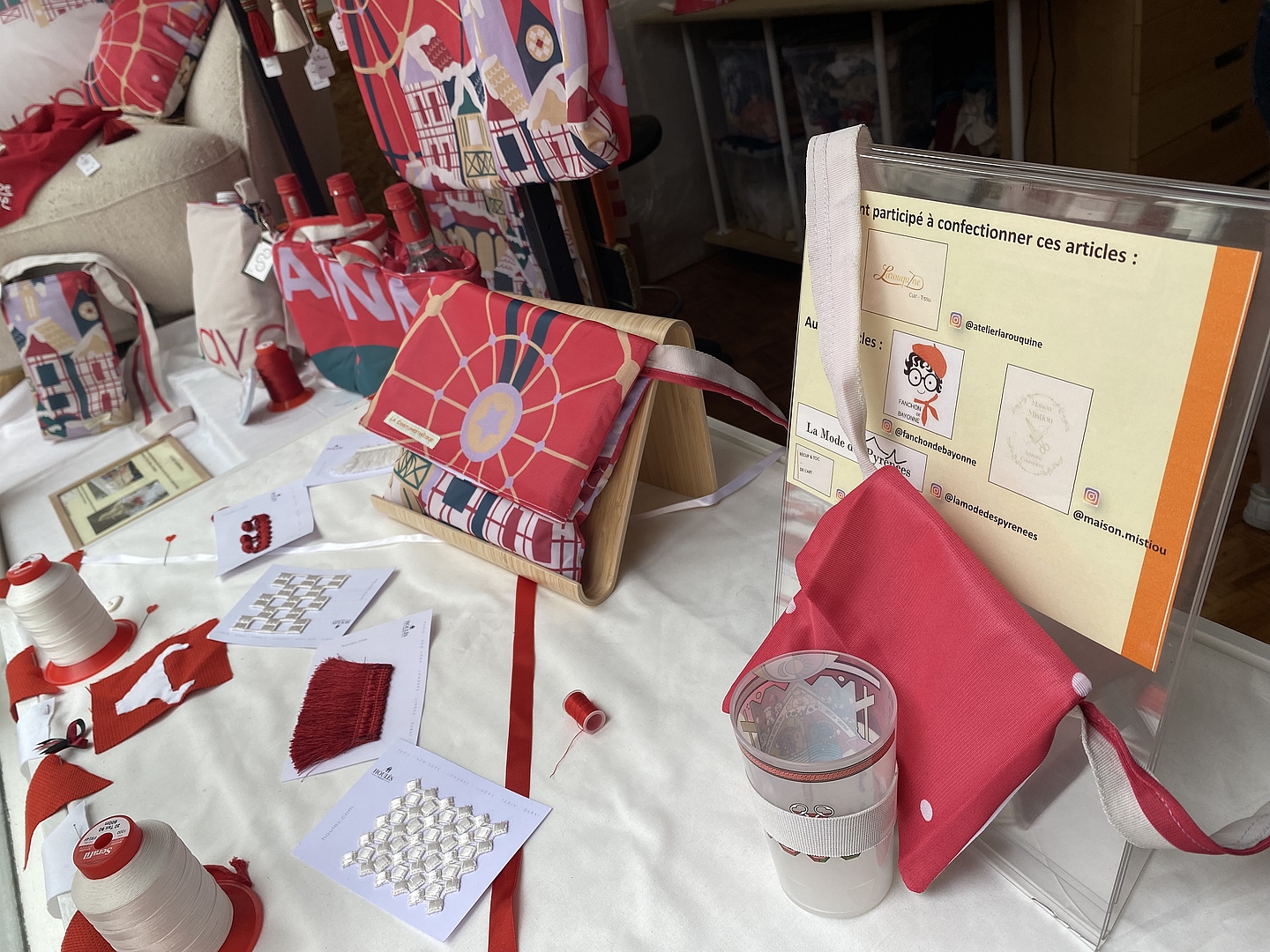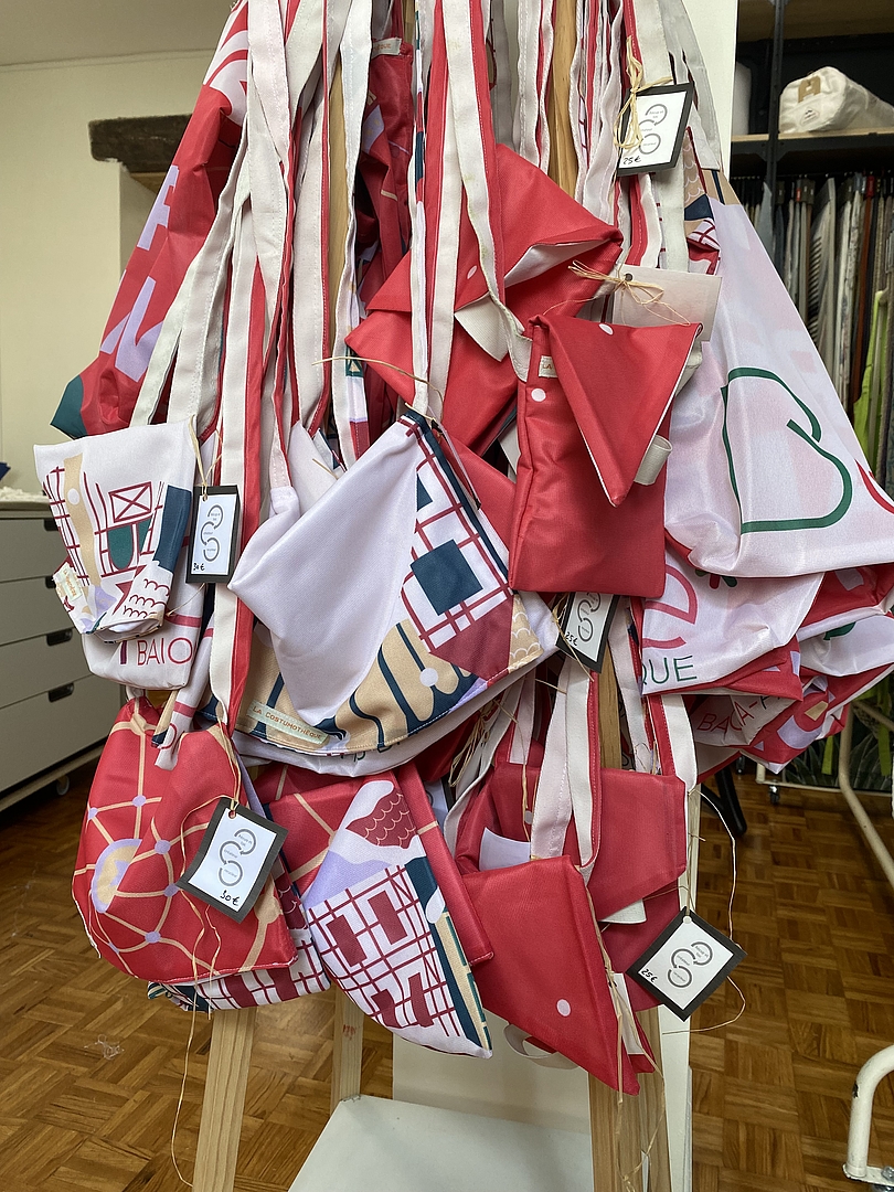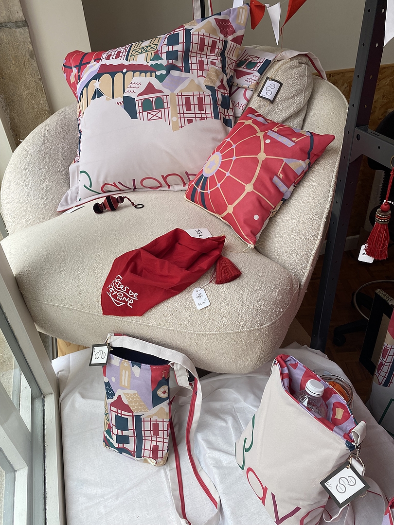 Mais à l’approche des Fêtes, en entraînant dans son idée un collectif de couturières « 100% récup et 100% locales », elle a dessiné une collection spécialement destinée aux Fêtes de Bayonne. Sacs bandoulières avec accroche-clé et accroche-gobelet, bob piqué arborant un Bayonne ou un Baiona selon le tissus choisi, cabas de plage ou de course emportant un bout des immeubles bayonnais ou besace dont le rabat, dans les frondaisons des dessins, devient un foulard ou une paire de lunettes. Toute une ligne qui permet d'emporter un bout d’évènement bayonnais tout en recyclant habilement des tissus déjà colorés qu’il eut effectivement été regrettable de mener à la benne.