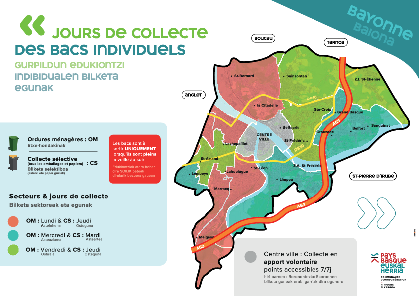 Pour les résidents des autres quartiers de Bayonne, un autre changement interviendra puisque la collecte en porte à porte se fera en fonction de jours et d'horaires modifiés par rapport à ce qui se pratiquait jusqu'alors (carte).