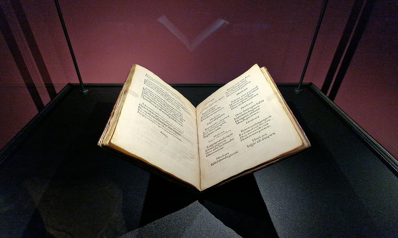 Son excellent état de conservation tient d'une part à la présence de sa couverture en cuir, travaillée. "Cette caractéristique révèle qu'il s'agissait d'un cadeau, explique Audrey Farabos, commissaire scientifique de l'exposition présentée jusqu'au 11 janvier 2026 au musée Basque et de l'histoire de Bayonne. Car, à cette époque, les livres étaient imprimés à blanc, c'est-à-dire sans reliure, et vendu emballé dans un tissu blanc pour les préserver. Cet exemplaire de "Linguae vasconum primitiae", l'unique connu à ce jour, avait été offert au neveu de Jeanne d'Albret, prince de sang." D'où la couverture.