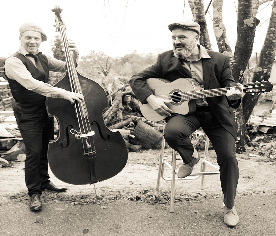 Les Fichus Calotins vous font voyager au son de la guitare et de la contrebasse dans ce nouvel écrin architectural : la place Michèle et André Pintat.
