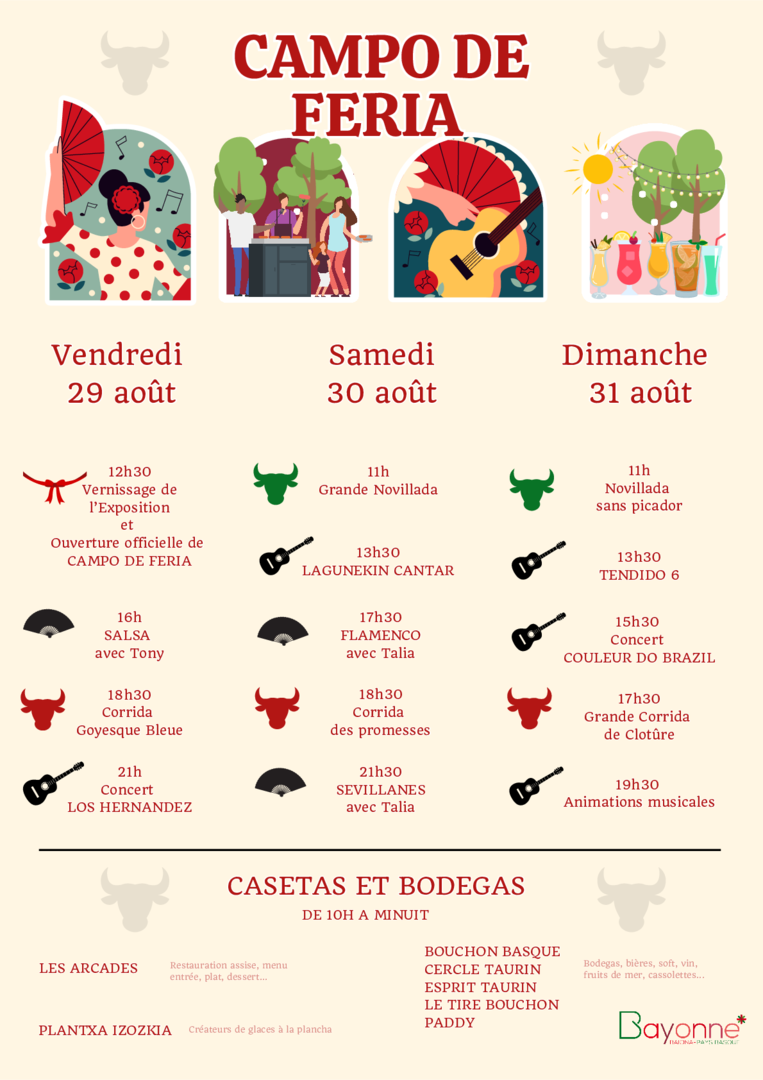 Autour de la célèbre Feria de l’Atlantique qui voit défiler sur le ruedo bayonnais les plus grandes vedettes de la tauromachie mondiale, la Ville de Bayonne organise un village d’ambiance andalouse festive et taurine : Campo de Feria. Concerts et animations animent toute la journée les alentours des « casetas » gastronomiques.