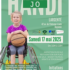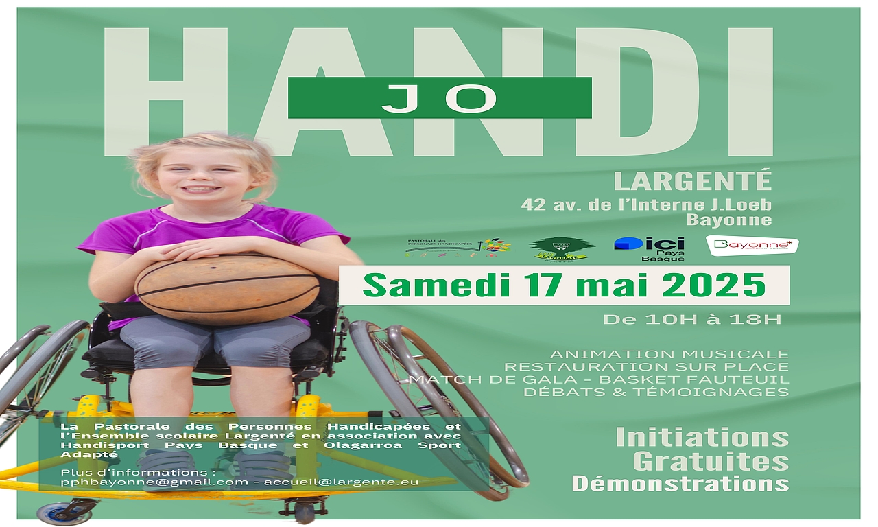 Du à 12h32 Tout publicLargenté - BayonneHandicap, SportHANDI JOLa Pastorale des Personnes Handicapées et l’Ensemble scolaire Largenté en association avec Handisport Pays Basque et Olagarroa Sport Adapté organisent samedi 17 mai 2025 de 10h à 18h une journée festive et sportive consacrée au handisport : Handi JOOrdre du jourAjouter à mon calendrierAnimation musicale, restauration sur place, match de gala, basket fauteuil, débats et témoignages.Consultez le programme détaillé de la journée (PDF)Localiser LocaliserLargentéPrécédentTous les événementsSuivant