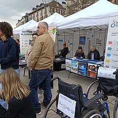 Stand de sensibilisation au quotidien des personnes en situation de handicap moteur et proposition au grand public de réaliser un parcours fauteuil en environnement urbain afin d’être initié aux problématiques d’accessibilité rencontrées par les personnes qui circulent en fauteuil roulant.