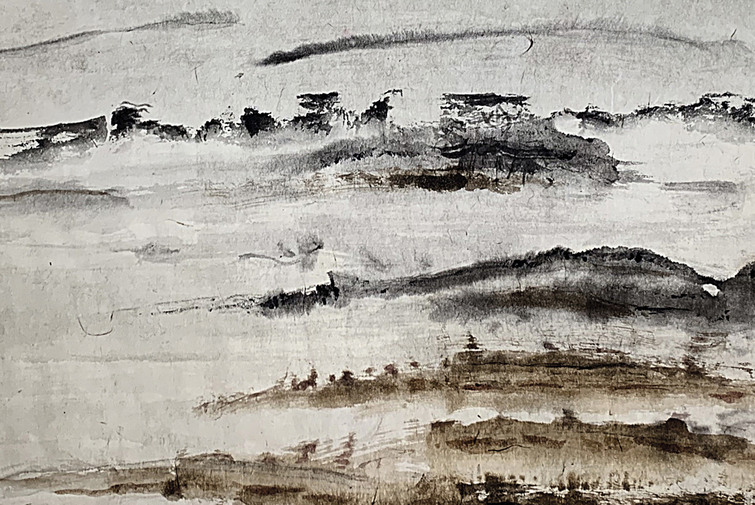 Cette approche articule le motif – des paysages, majoritairement montagneux vus de loin, souvent perdus dans les limbes – au geste artistique immédiat que suscite le travail à l’encre de Chine sur papier.